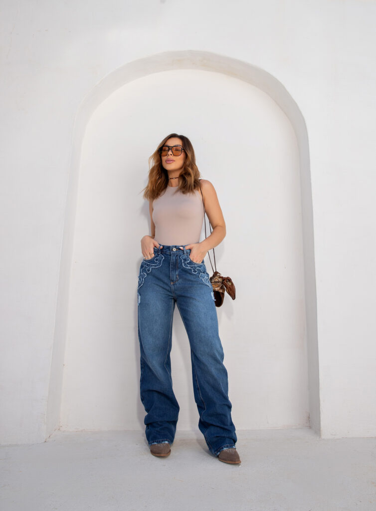 Calça Jeans Wide Leg Feminina Cintura Alta Bordado Ana Castela 24331 Média