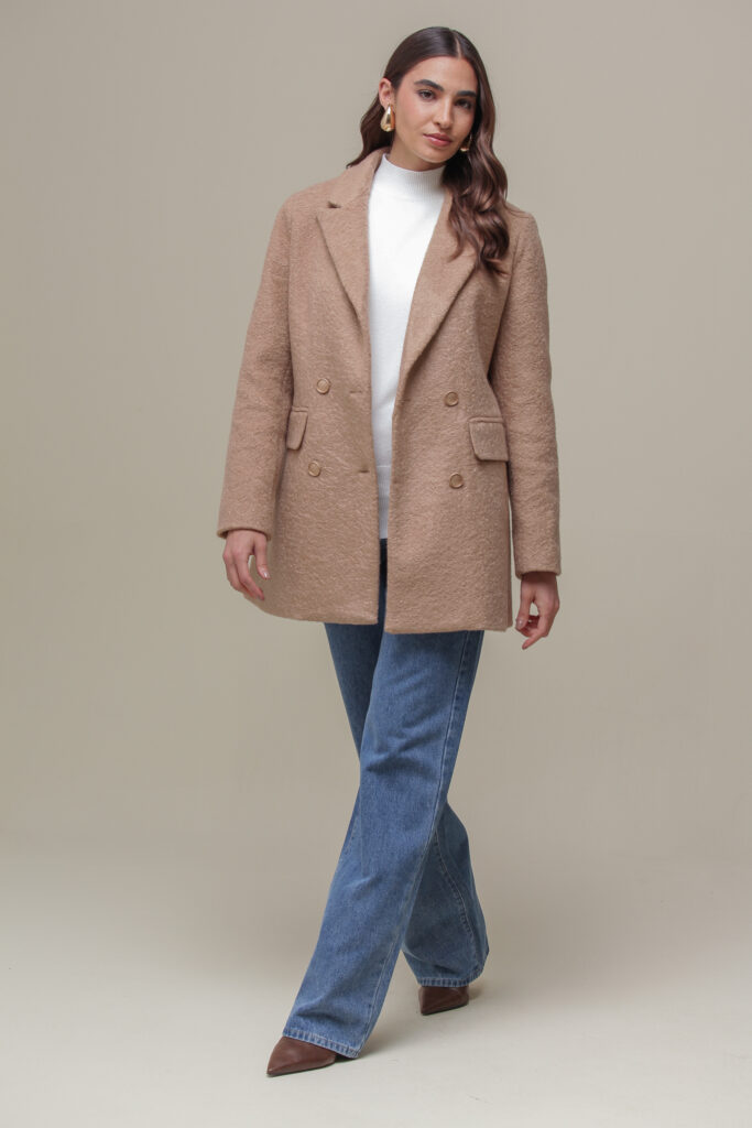 Blazer estruturado, revestido em pelinho batido, com fechamento frontal transpassado e bolsos frontais com lapelas. A modelagem acinturada e alongada, com ombreiras, confere sofisticação à peça, que também possui gola tradicional e forro interno.