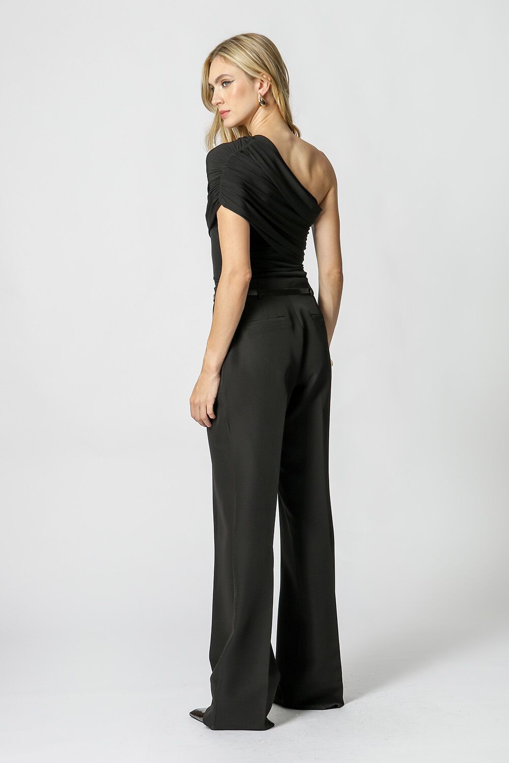 Calça de alfaiataria reta com cinto fino em courino e fivela dourada.