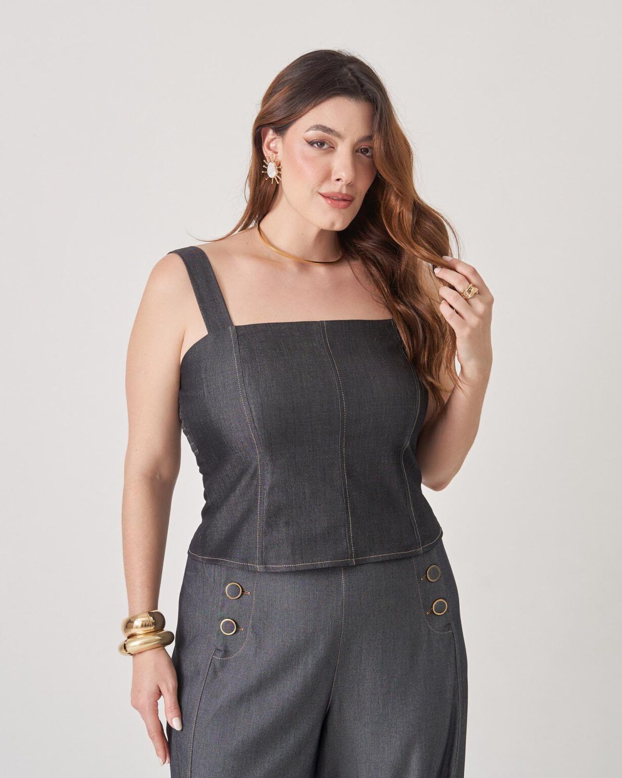 Modelagem com shape ajustado ao corpo. Alças largas e decote quadrado garantem sustentação e modernidade. Fechamento posterior em zíper dourado, além de lastex nas costas e elástico na alça que oferece ajuste confortável ao corpo.