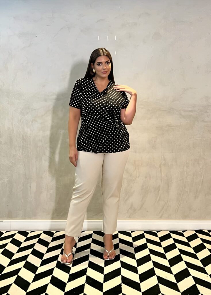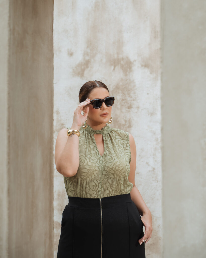 Blusa de estilo cavado com decote em “V” frontal e botão nas costas. Modelagem elegante, com costas fechadas, ideal para looks sofisticados e modernos, trazendo um toque de charme e frescor