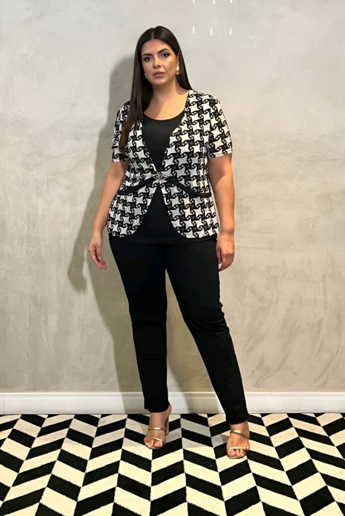 Camisa estampada de estilo elegante, com manga cavada e decote em gota, oferecendo um toque delicado e sofisticado. As costas fechadas com laço e a gola alta complementam o design moderno e refinado, ideal para diversas ocasiões.