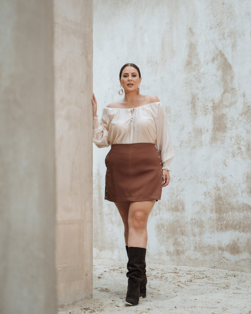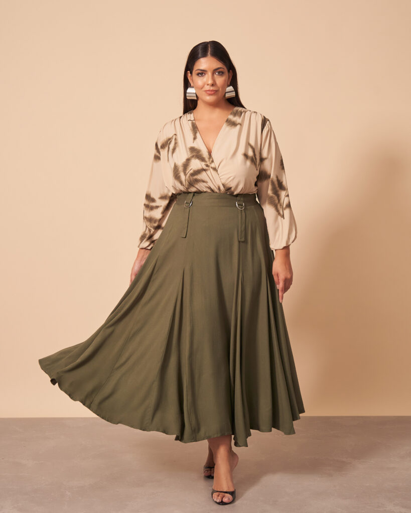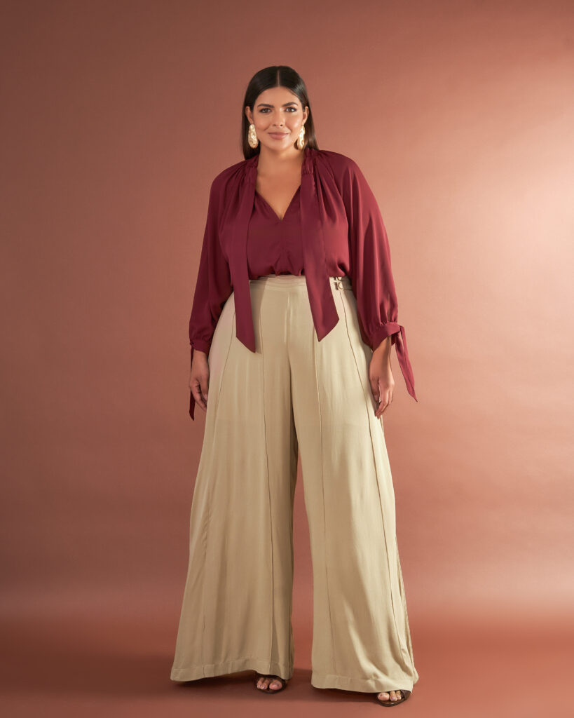 Blusa boho de tecido fluido, ideal para o dia a dia. Possui mangas bufantes que adicionam charme e gola alta com lenço embutido, conferindo elegância e estilo delicadamente despojado.