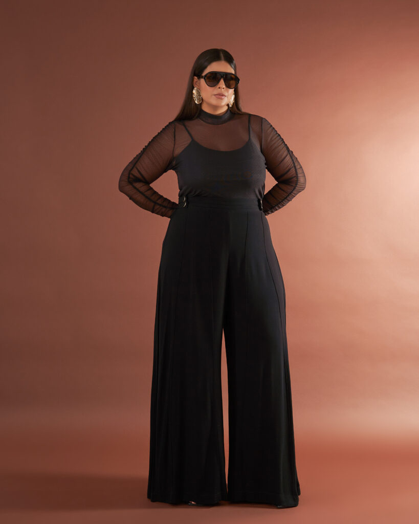 Blusa de tule moderna, manga longa e costas fechadas, com gola alta elegante. Transparência sutil e recorte refinado criam um visual ousado, sofisticado e perfeito para looks urbanos fashionistas.