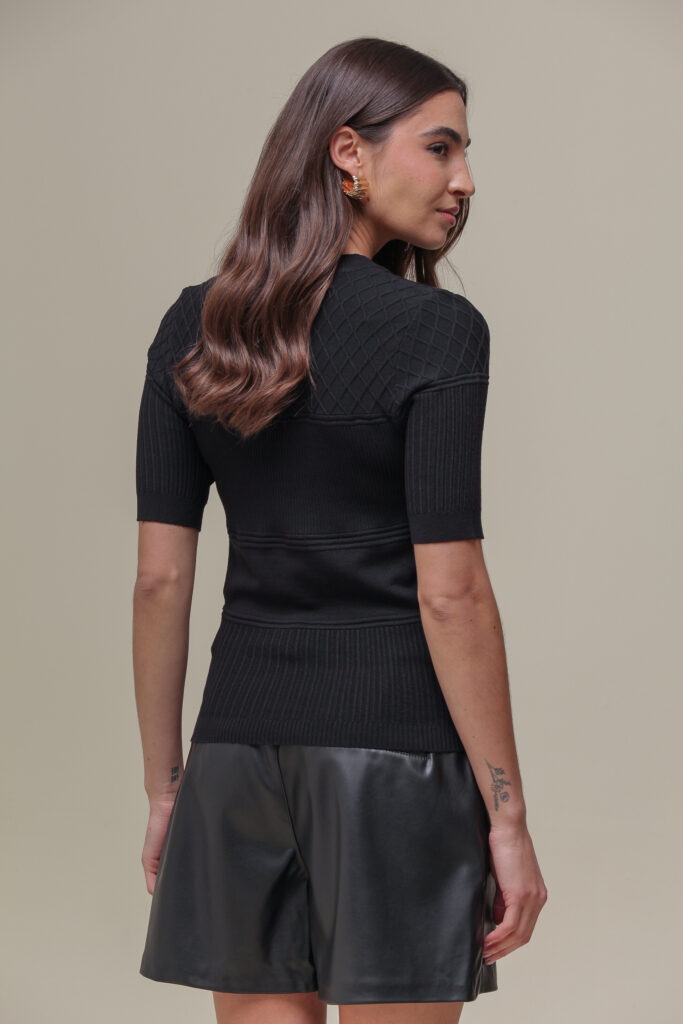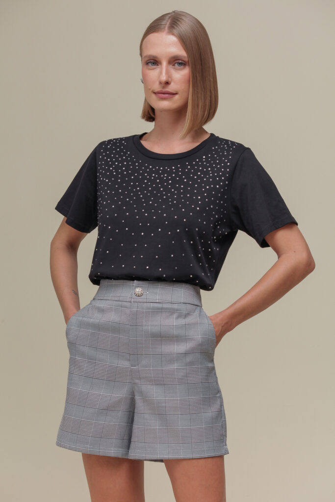 Blusa de malha fria com manga curta e gola careca, adornada com aplicação de strass na parte frontal