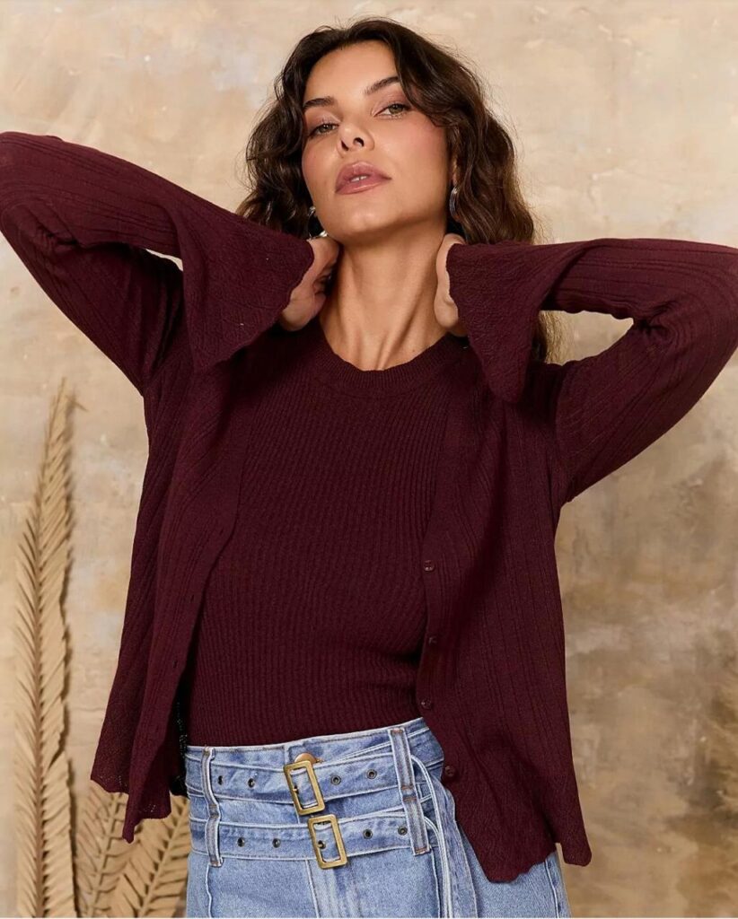 Cardigan básico em tricô, com decote em V e fechamento por botões frontais. Versátil e atemporal, é perfeito para sobreposições e combina com diversos estilos.