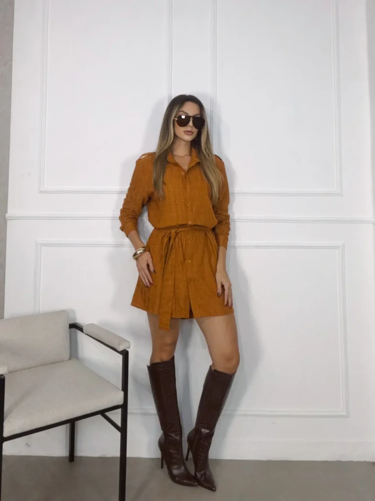 Chemise com tecido texturizado, com gola clássica e faixa amarração.