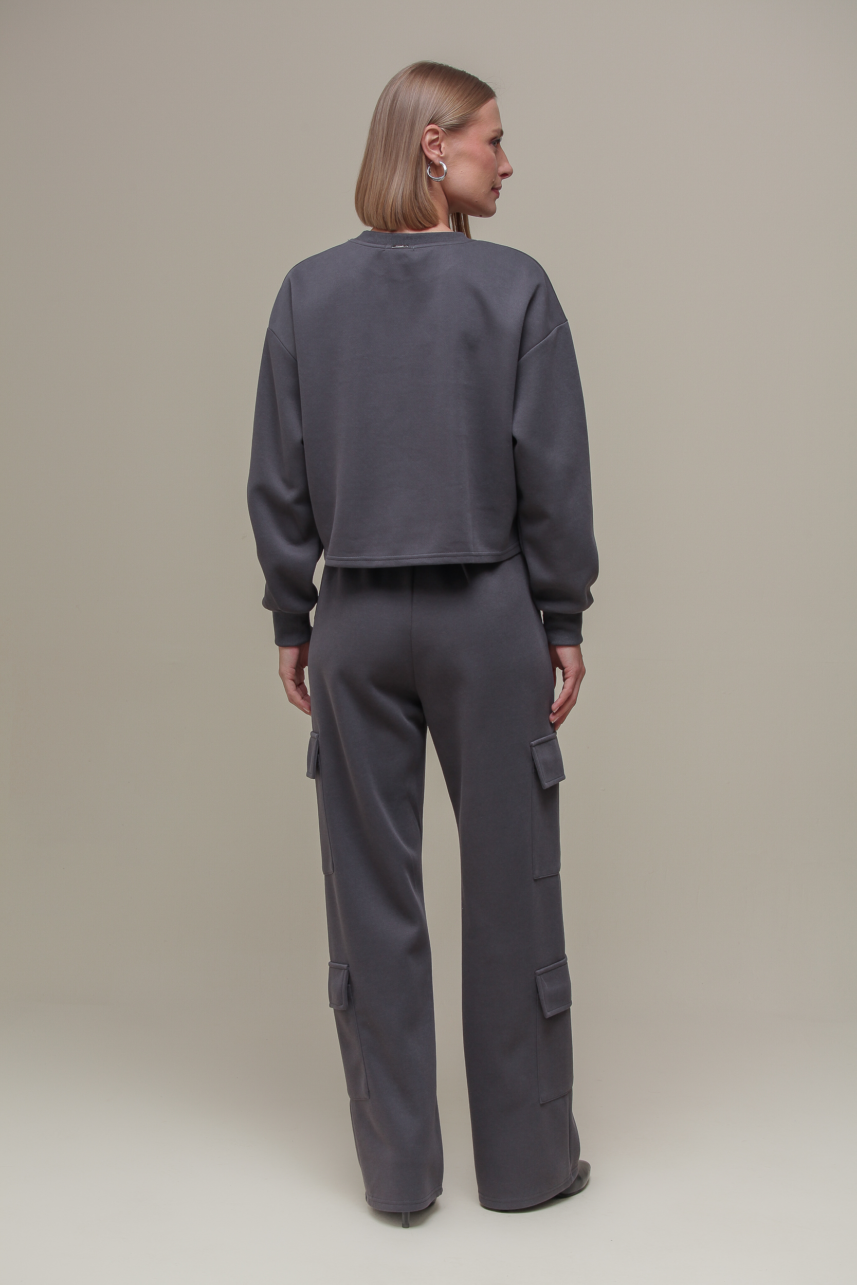 Conjunto de moletom com blusa cropped ampla, manga longa com ajuste nos punhos e gola careca complementada por uma corrente colar removível, dando um toque de modernidade.