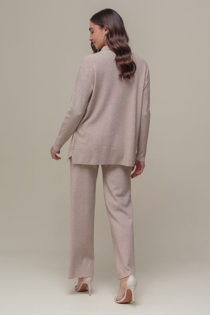Conjunto em tricô. Parte superior com blusa alongada, gola careca, abotoamento frontal e aplicação de strass nas mangas e na gola. Parte inferior com calça reta, cintura alta e cós largo com cordão para ajuste.
