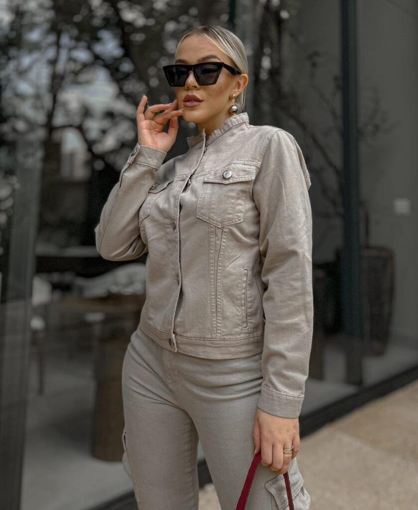 Jaqueta feminina 100% Jeans em tom capuccino. De recortes estilosos e cor que a tendência da estação