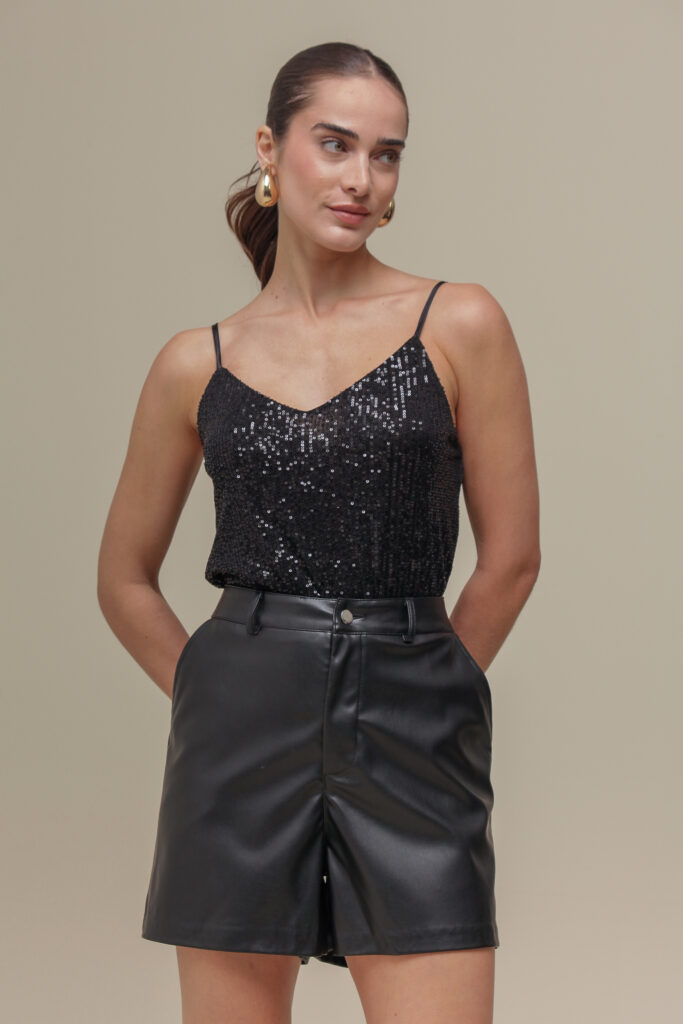 Regata de tule revestida com paetês, proporcionando um brilho sutil e sofisticado. Possui alças finas ajustáveis e decote V que valoriza o busto. Seu comprimento é perfeito,
