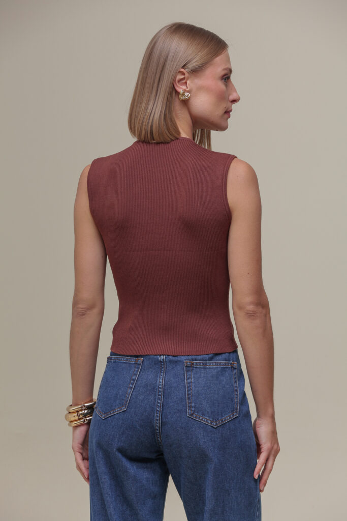 Regata de tricô com alças largas e gola alta, perfeita para um visual simples e elegante. O detalhe de costura frontal adiciona um toque sutil e sofisticado à peça, ideal para combinações versáteis.