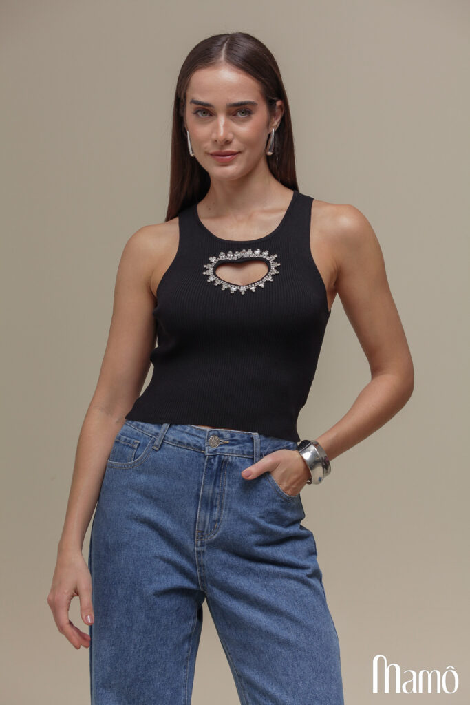 Regata curta em tricô com gola U e alças largas. A parte frontal apresenta um recorte em forma de coração, adornado com pedrarias e strass, criando um contorno delicado e sofisticado.