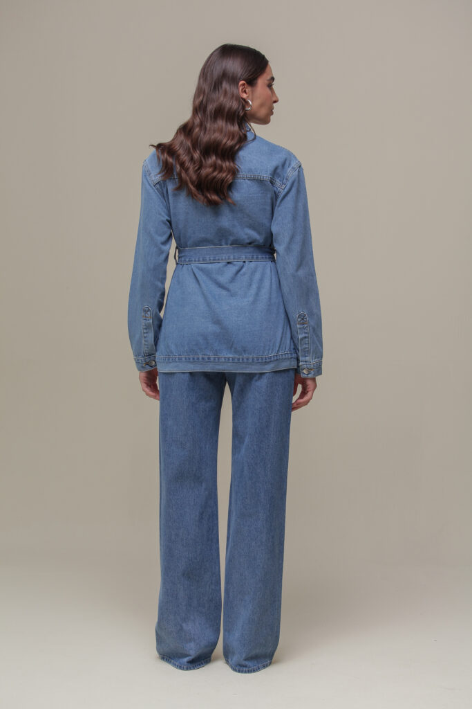 Saia curta em jeans com aplicação de rebites metalizadas na parte frontal, adicionando um toque de modernidade e estilo.